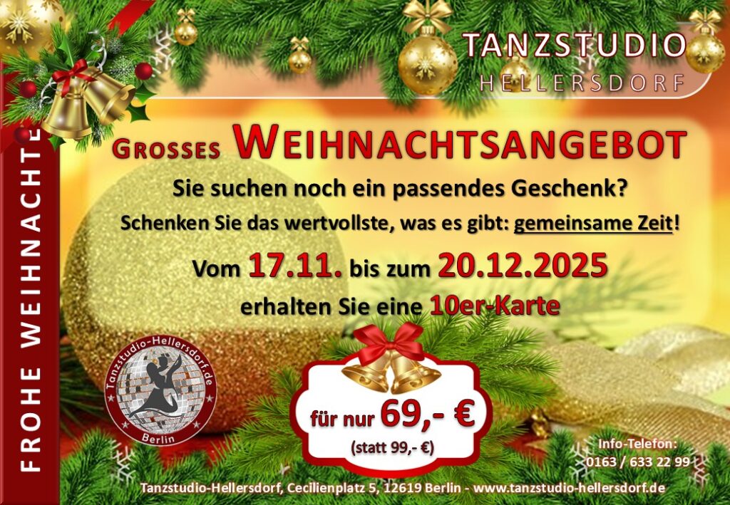 Tanzen per 10er-Karte! Ohne Vertrag, ohne Anmeldegebühr! Hier macht Tanzen lernen richtig Spaß. Auch für „Linksfüßler“ geeignet. Einstieg jederzeit möglich. Regelmäßige Kurse und Praktika für Tanzpaare und alle, die mal wieder ihre Schritte trainieren und üben möchten.